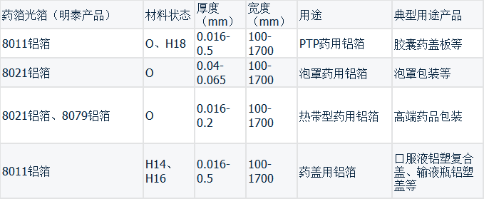| 藥箔光箔(明泰產(chan) 品) | 材料狀態 | 厚度(mm) | 寬度(mm) | 用途 | 典型用途產(chan) 品 |